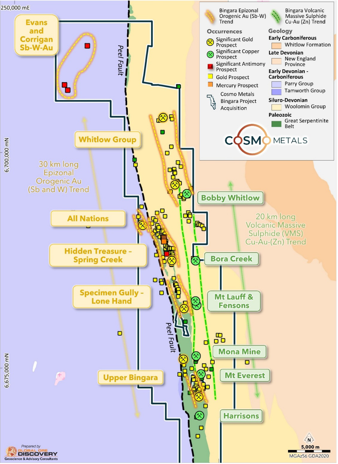 - The 30 km long Epizonal Orogenic Au (Sb and W) trend – Bingara goldfields