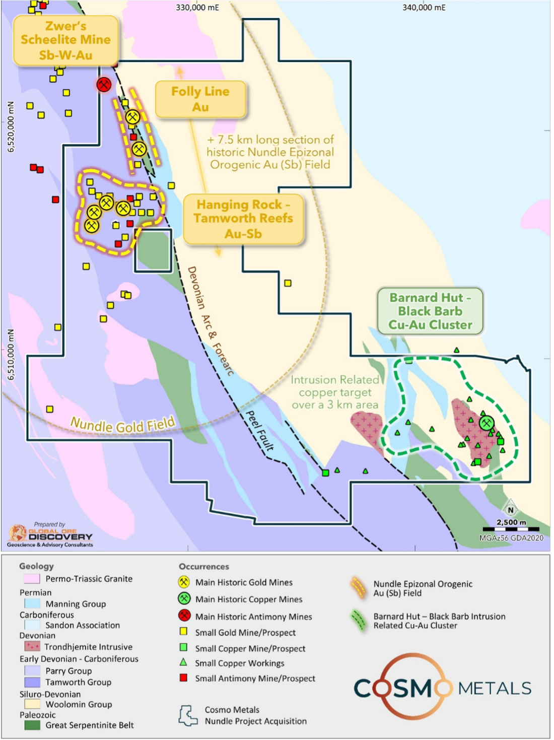 - A +7.5 km long section of the historic Nundle Epizonal Orogenic gold (antimony) field